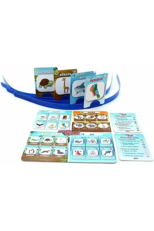 Kutu içeriği (görsellerden): Kafa bantları, hayvan kartları, pul/jetonlar, kategori/oyun panoları ve ipucu soru kartları