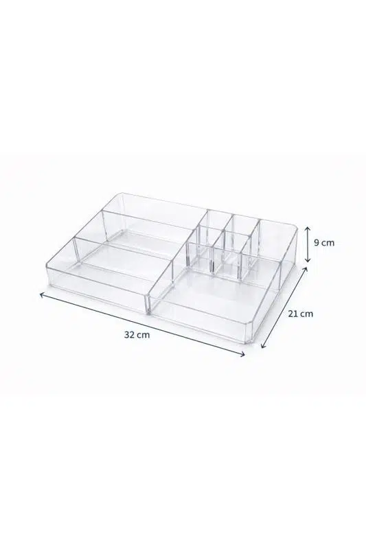 9 bölmeli fonksiyonel tasarımı ile ruj, fondöten, fırça, parfüm, saat, yüzük, küpe ve kolye gibi farklı boyutlardaki ürünler için ideal alanlar sunar. Masa üstü kullanım için uygundur ve makyaj masanıza modern, minimal bir görünüm kazandırır.