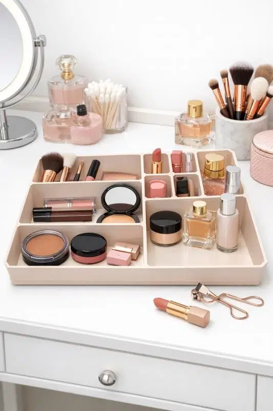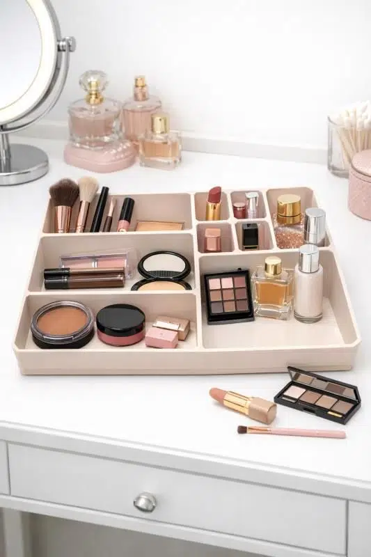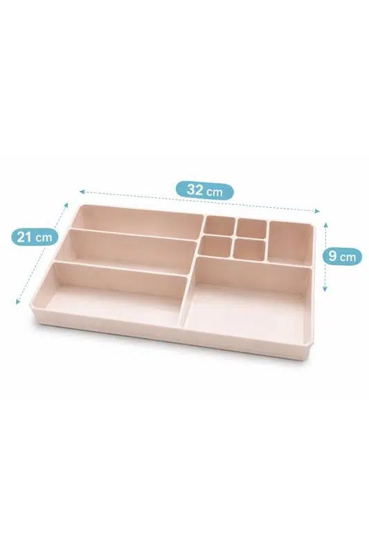 9 farklı bölmesi ile; rujlar, fondötenler, makyaj fırçaları, parfümler, yüzükler, küpeler ve diğer aksesuarlar için ideal bir düzen sunar. Günlük kullanımda dağınıklığı ortadan kaldırır, zamandan tasarruf etmenizi sağlar.