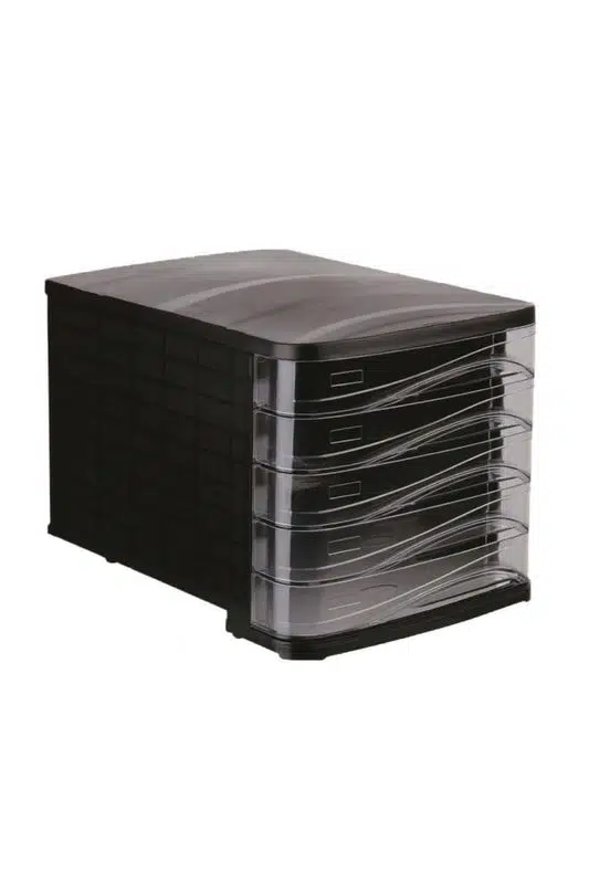 Ark Evrak Rafı 5’li Çekmeceli Siyah, modern tasarımı ve kullanışlı yapısıyla evraklarınızı, dosyalarınızı ve kırtasiye malzemelerinizi düzenli tutmanın en kolay yolunu sunar.