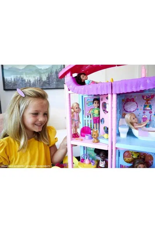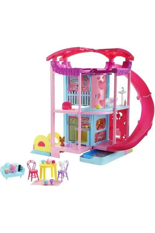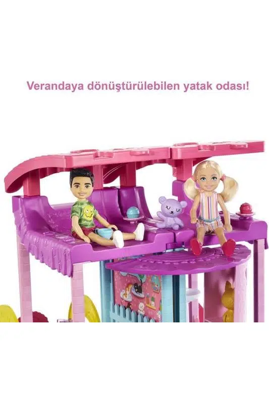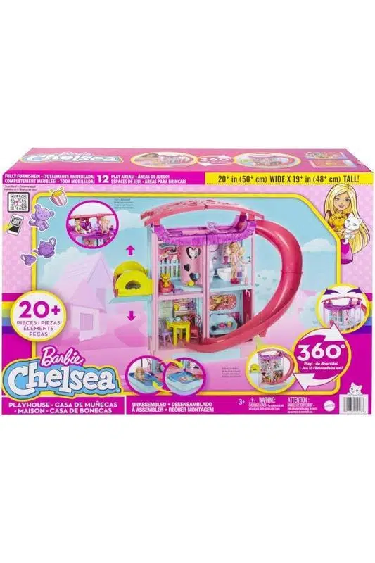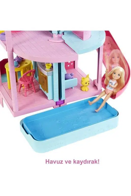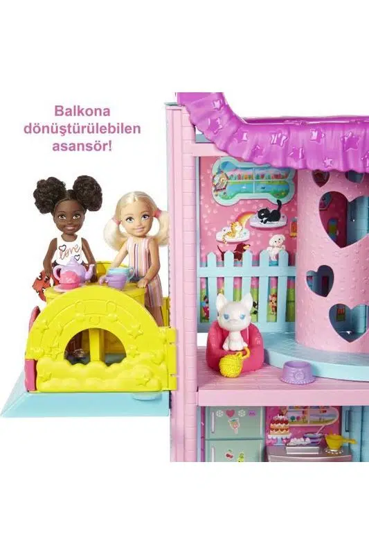 Barbie Chelsea Oyun Evi – 3 Katlı Dönüşebilen Ev ve 20+ Aksesuar (HCK77)