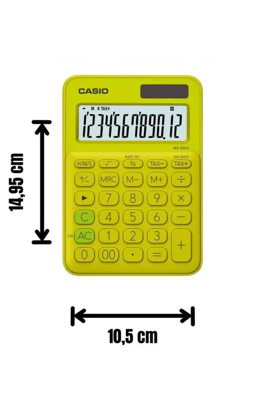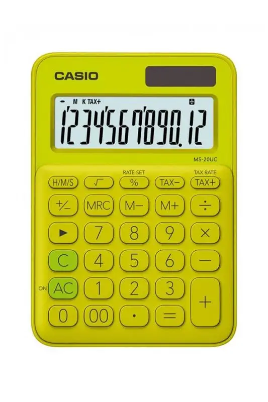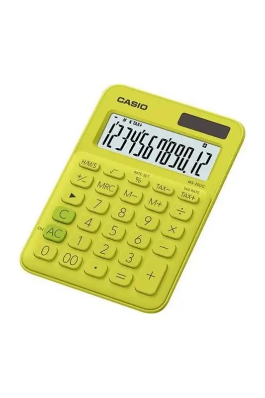 Renkli, şık ve işlevsel! Casio’nun çim yeşili ve sarı renk tonlarıyla öne çıkan MS-20UC-YG hesap makinesi, hem ofiste hem evde pratik kullanım sunar.