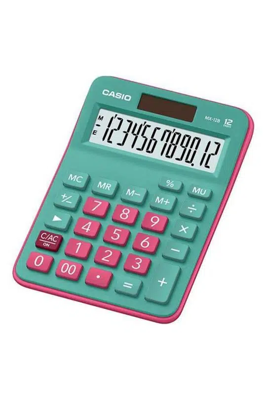 Casio MX-12B-GNRD 12 Haneli Yeşil + Pembe Masaüstü Hesap Makinesi – Güneş Enerjili, Renkli ve Ergonomik Tasarım
