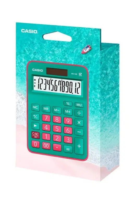 Canlı yeşil ve pembe tonlarıyla masanıza renk katacak Casio MX-12B-GNRD, güneş enerjili sistemi, geniş ekranı ve ergonomik yapısıyla hem şık hem pratik bir masaüstü yardımcısıdır.