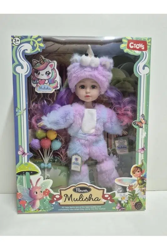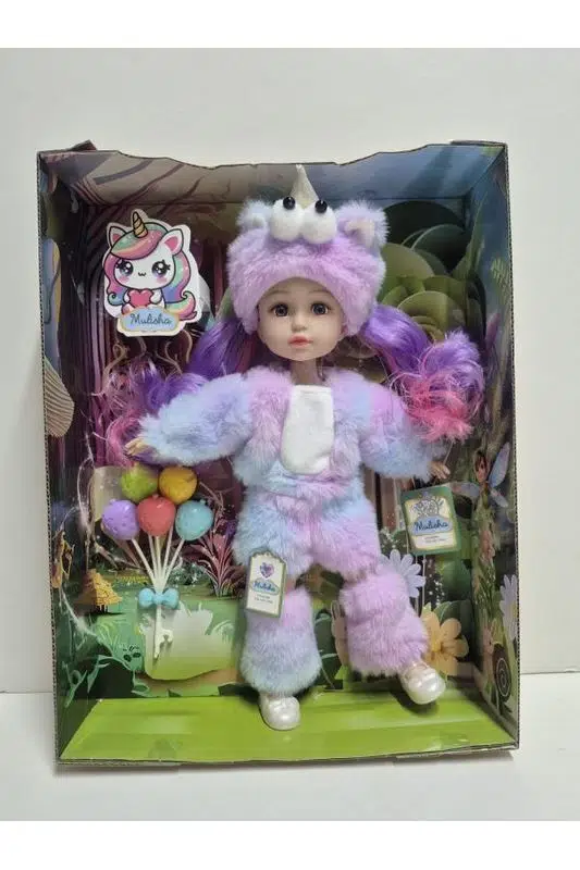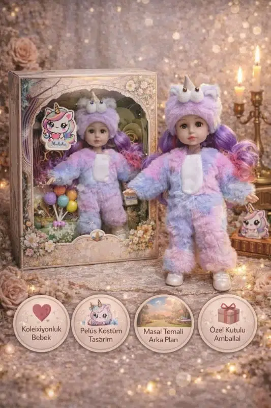 Bebeğin unicorn şapkası üzerindeki boynuz ve büyük göz detayları ürüne benzersiz bir karakter kazandırırken, renkli saçları ve aksesuarları oyunları daha keyifli hale getirir. Masal temalı arka planı ve özel kutulu ambalajı sayesinde ürün hediye için de mükemmel bir seçenektir.