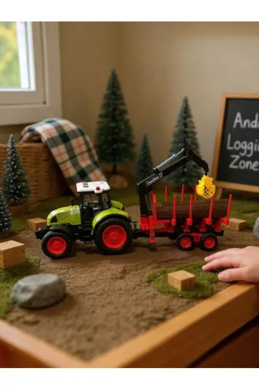 Traktörün arkasındaki ahşap kovalı römork, dört adet ağaç gövdesiyle birlikte gelir. Bu sayede çocuklar orman taşımacılığı, yükleme ve boşaltma gibi aktiviteleri canlandırarak rol yapma becerilerini geliştirirler. Traktörün sürtünmeli (friction powered) sistemi, pille çalışan ses efektleriyle birleşerek uzun süreli eğlence sağlar.