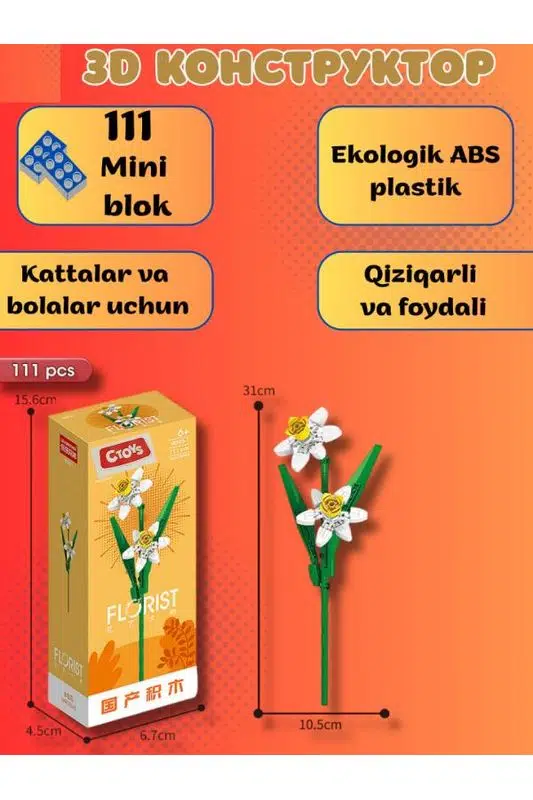 Ctoys Çiçek Blokları 9095-1 Narcissus, 6 yaş ve üzeri çocuklar için tasarlanmış, yaratıcılığı ve inşa etme becerilerini destekleyen özel bir çiçek yapı blokları setidir. 111 parçadan oluşan bu set, çocuklara keyifli ve detaylı bir yapım süreci sunarken hayal güçlerini aktif şekilde kullanmalarını sağlar.