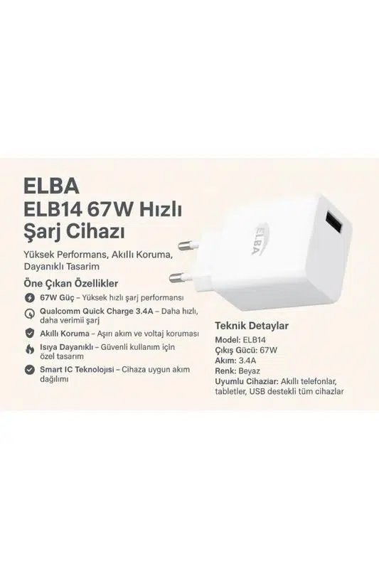 ELBA ELB14 Travel Charger, günlük kullanımda ihtiyaç duyduğunuz hız ve güvenliği bir arada sunar. 67W gücü sayesinde cihazlarınızı kısa sürede şarj ederken, akıllı koruma teknolojisi ile güvenli bir deneyim yaşamanızı sağlar.