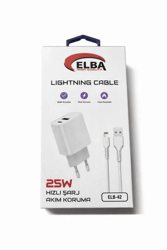 Elba ELB42 25W Şarj Seti, iPhone kullanıcıları için güvenli, hızlı ve dayanıklı bir şarj çözümü sunar.