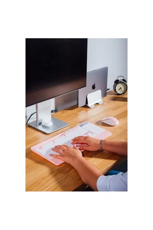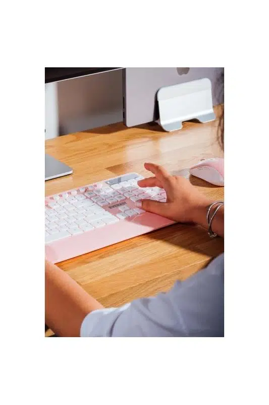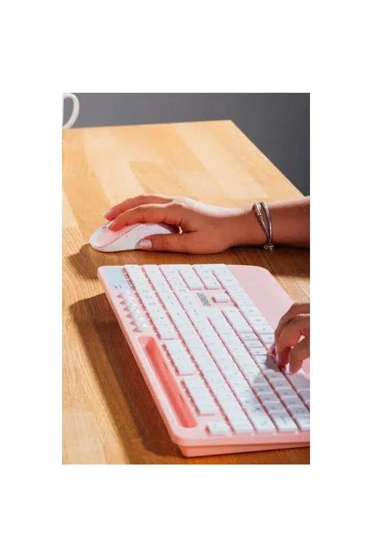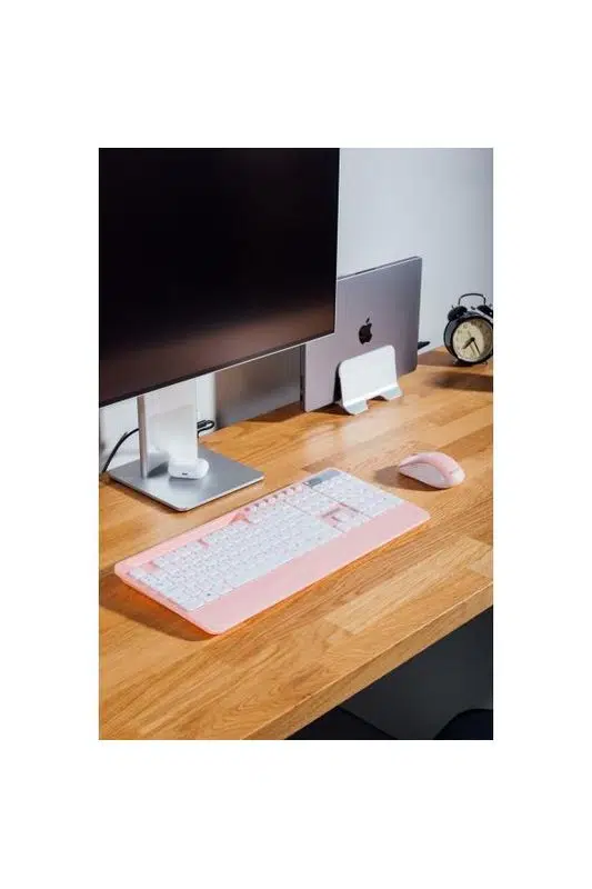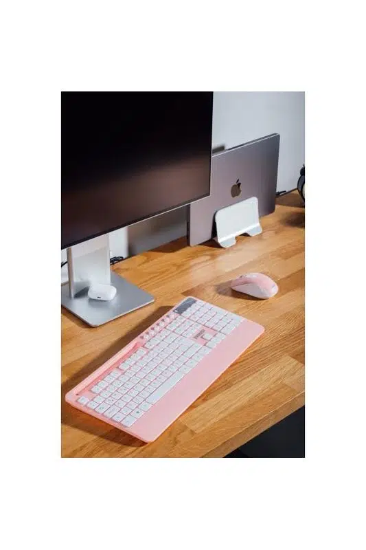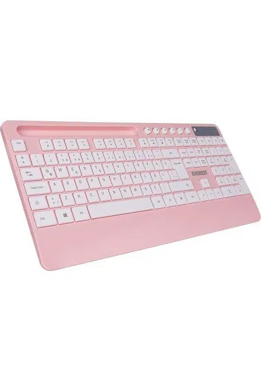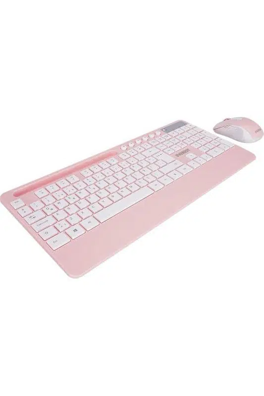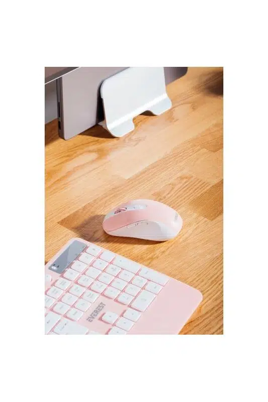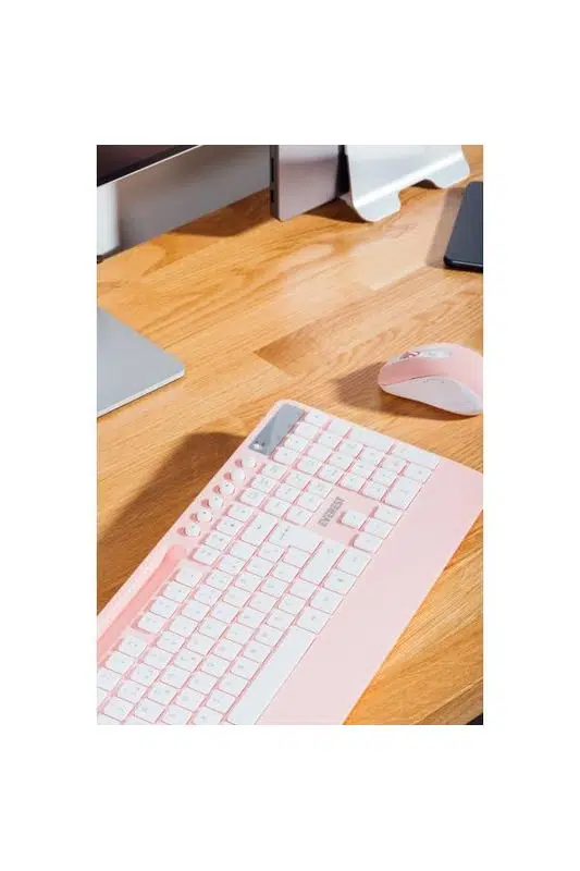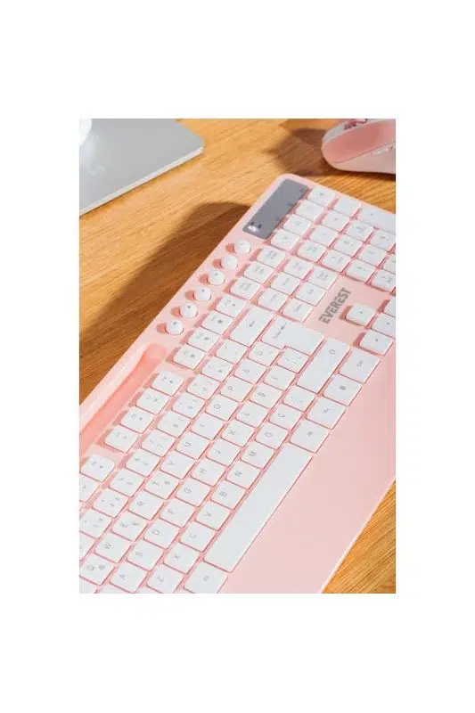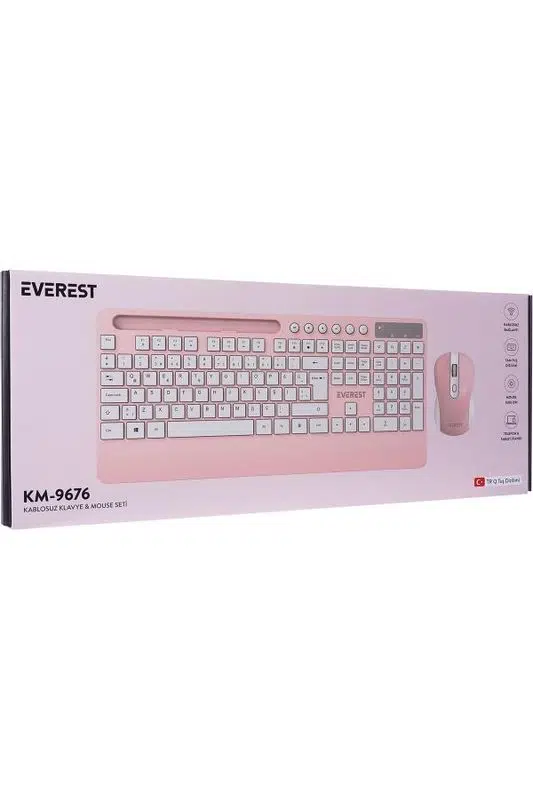 Everest KM-9676 Klavye ve Mouse Seti, modern ofis ve ev kullanıcıları için hem estetik hem de işlevsel bir çözüm sunar. Şık beyaz ve pembe renk kombinasyonu, çalışma alanına zarif bir dokunuş kazandırırken; entegre tablet ve telefon standı, ergonomik kullanım sağlar.