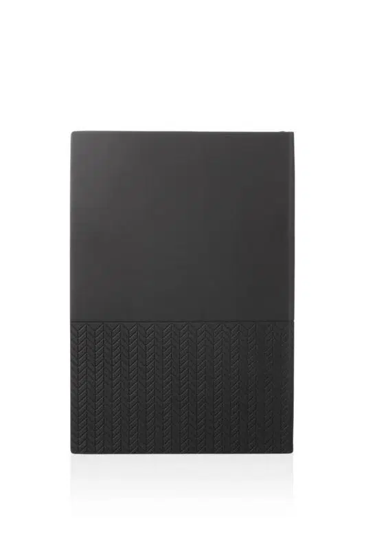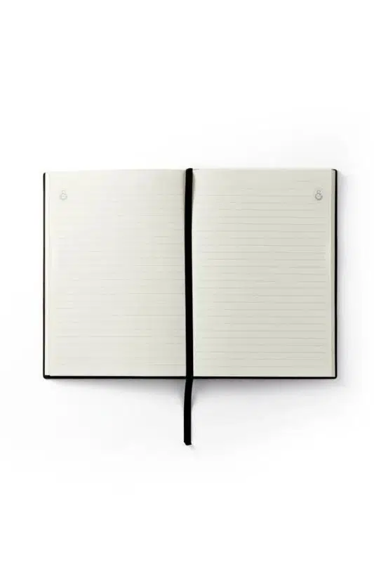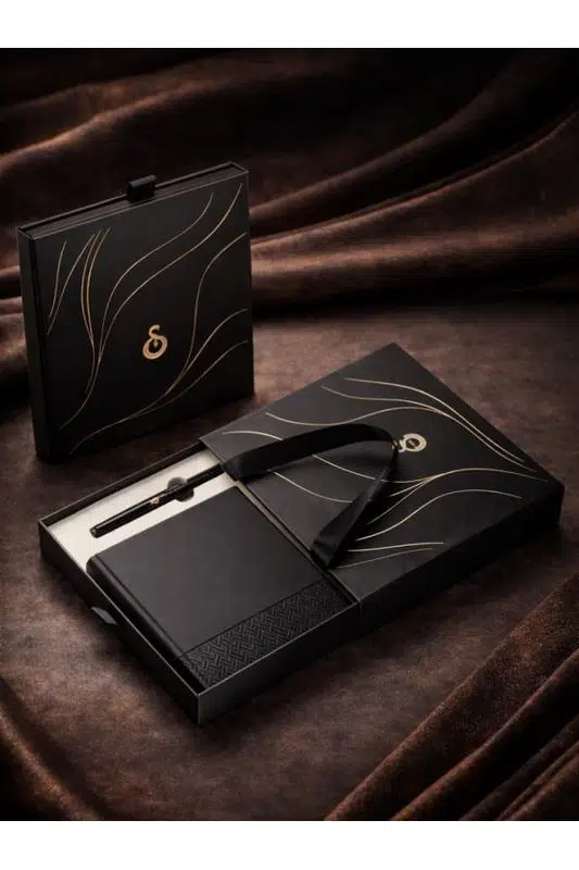 Set içerisinde yer alan 96 yaprak çizgili A5 defter, kaliteli kapağı ve modern dokulu tasarımıyla premium bir görünüm sunar. Defterin iç kısmında çizgili sayfalar bulunur ve ortasında şerit ayraç detayı yer alır.