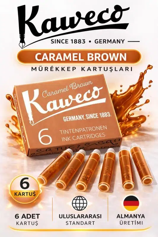 Kaweco Karamel Kahverengi mürekkep kartuşları, yazılarına sıcak ve doğal bir ton katmak isteyen dolma kalem kullanıcıları için tasarlanmıştır. Karamel tonlu kahverengi rengi sayesinde yazılarınız klasik siyah ve mavi tonların dışına çıkarak daha karakterli ve estetik bir görünüm kazanır.