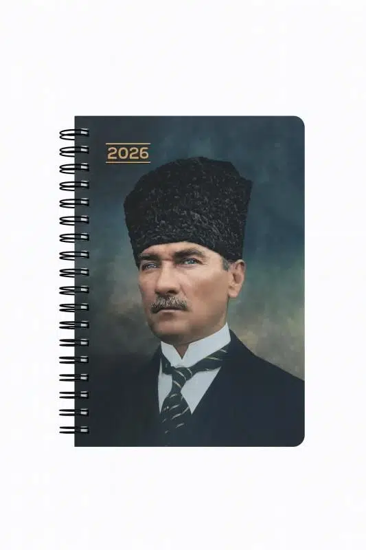 Başkomutan Atatürk görselli, günlük kullanım için tasarlanmış, 1. sınıf hamur kâğıtlı, sağlam spiralli ajanda. Önemli günler, aylık plan çizelgesi ve yapışkan sticker sayfası ile yıl boyu düzeninizi koruyun.
