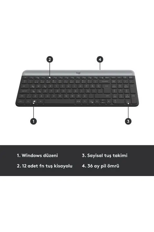 Görselde de görüldüğü üzere klavye, sayısal tuş takımına sahip tam boy ama ince formda bir yapıya sahiptir. Düşük profilli makas (scissor) tuş teknolojisi, yumuşak ve sessiz bir yazım deneyimi sunarken Windows için optimize edilmiş Türkçe Q klavye düzeniyle günlük kullanımı kolaylaştırır.