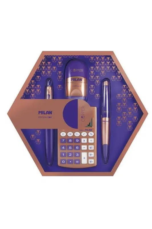 Milan Hediyelik Hesap Makinesi, Tükenmez ve Kurşun Kalem, Kalemtraş Set – Edition Box Copper Mor