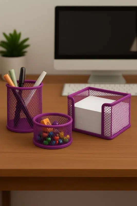 Ofis düzeninizi şıklıkla tamamlayın! Masaüstü Mor Kalemlik Seti, masanızı hem düzenli tutar hem de estetik bir görünüm kazandırır. Kaliteli malzeme yapısı ve zarif tasarımıyla dikkat çeken bu set, çalışma alanlarınızda işlevsellik ve şıklığı bir arada sunar.