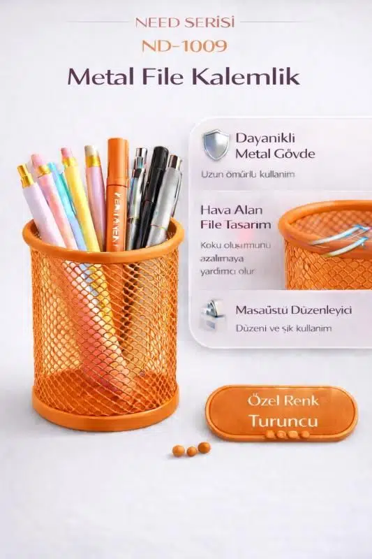 Masanıza zarif bir dokunuş katmak ister misiniz?Need Perfore File Turuncu Kalemlik, şık tasarımı ve işlevsel yapısıyla ofis, okul veya ev kullanımı için ideal bir organizasyon çözümüdür.