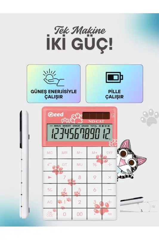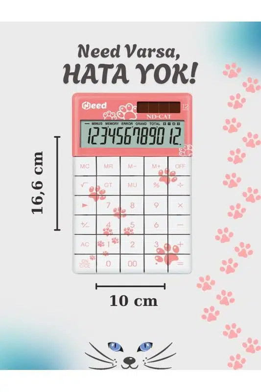 Ofis, okul ya da ev kullanımı için mükemmel bir yardımcı arıyorsanız, ND-CAT Pembe Kedi Pati Desenli Hesap Makinesi tam size göre! Sevimli kedi pati desenli tasarımıyla çalışma alanınıza renk ve enerji katarken, güçlü teknik özellikleriyle hesaplamalarınızı kolaylaştırır.