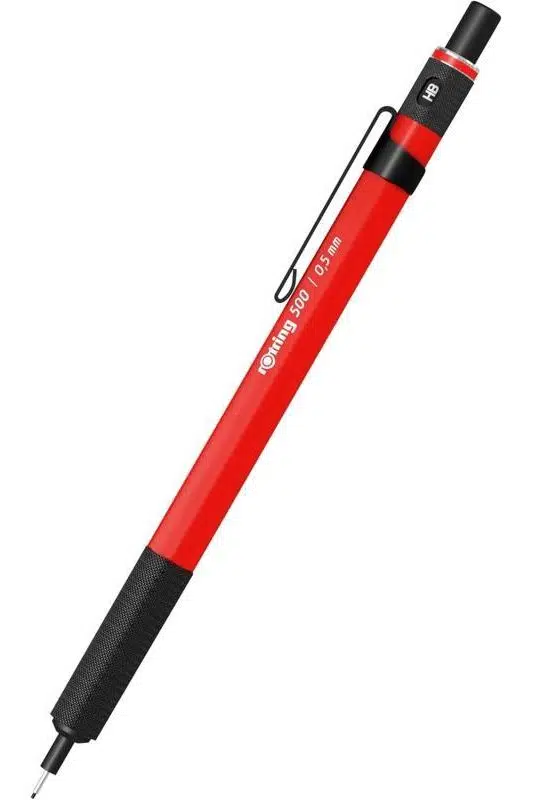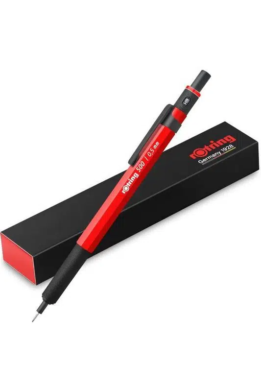 Parlak kırmızı tasarımıyla hem profesyonel hem de modern bir görünüm sunan rOtring 500; öğrenciler, mimarlar, mühendisler ve tasarımcılar için yazı, eskiz ve teknik çizimlerde ideal bir yazım aracıdır.