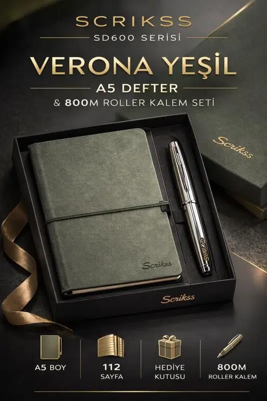Scrikss SD600-11 Verona Yeşil A5 Defter ve 800M Roller Kalem Seti, şıklığı ve kullanım konforunu bir araya getiren özel bir yazım setidir. Verona serisinin zarif dokulu yeşil defteri ile krom kaplama Scrikss 800M roller kalem, hem günlük notlar hem de profesyonel kullanım için estetik ve fonksiyonel bir deneyim sunar.
