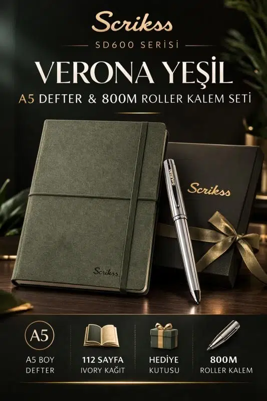 Scrikss SD600-11 Verona Yeşil A5 Defter & 800M Roller Kalem Krom Set