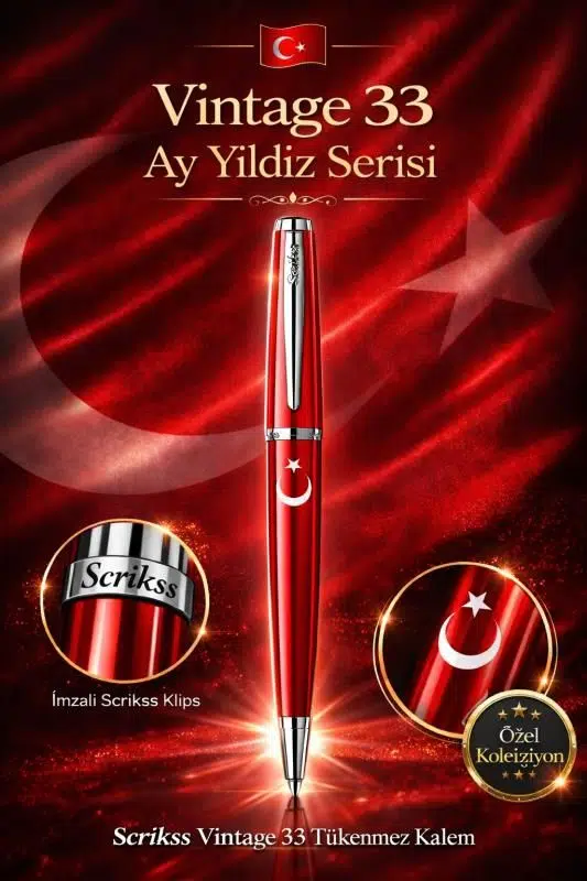 Scrikss Vintage 33 Tükenmez Kalem Kırmızı Ay-Yıldız Baskılı, markanın klasikleşmiş Vintage serisinin ikonik tasarımını modern kullanım konforu ile buluşturur. İlk kez 1968 yılında üretilen Vintage 33 serisinin zamansız çizgileri korunarak geliştirilen bu model, hem günlük kullanım hem de koleksiyon değeri taşıyan özel bir kalem olarak öne çıkar.