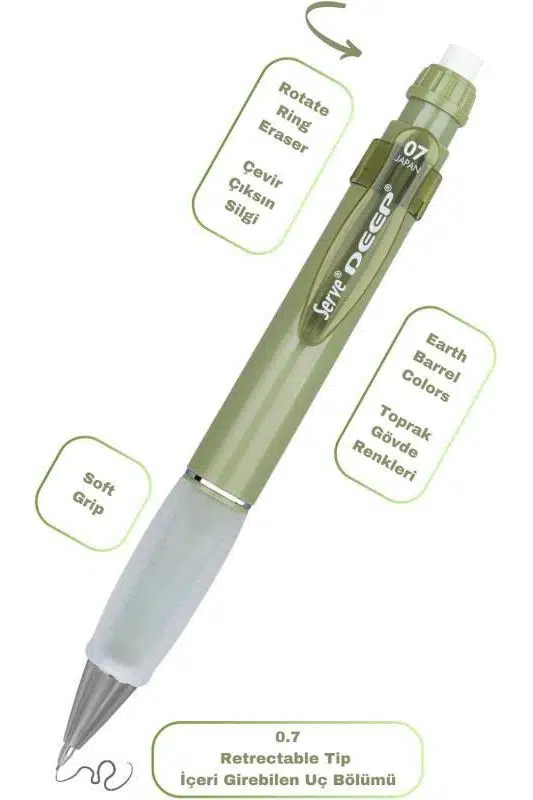 Konforlu ve akıcı bir yazım deneyimi sunan Serve Deep 0.7 mm Kalem Grip & Silgi Yedekli Set – Mercan, ergonomik kavrama (grip) özelliği sayesinde uzun süreli kullanımlarda ekstra rahatlık sağlar. Dayanıklı mekanik yapısı ve kaliteli uç sistemi ile okulda, ofiste ve günlük kullanımda net ve temiz yazım performansı sunar.