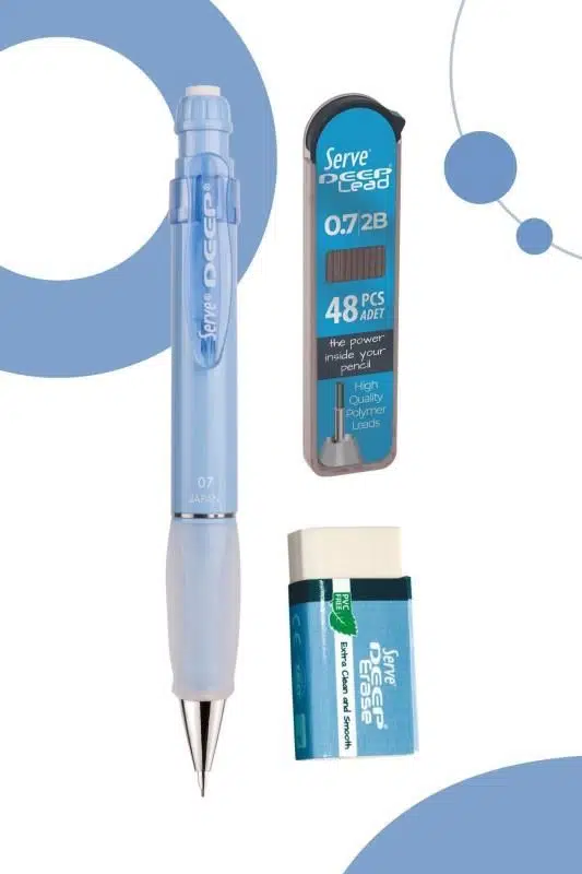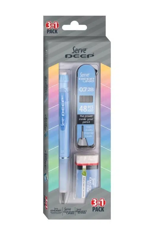 Serve Deep 0.7 mm Gök Mavi 3’lü Kalem Seti; gizlenebilir metal uç mekanizmasına sahip versatil kalem, 48 adet yüksek kaliteli 2B grafit min ve beyaz silgiden oluşur. Okul, ofis ve günlük kullanım için tasarlanan bu set, ergonomik yapısı ve dayanıklı mekanizması sayesinde uzun ömürlü ve konforlu bir yazım deneyimi sunar.