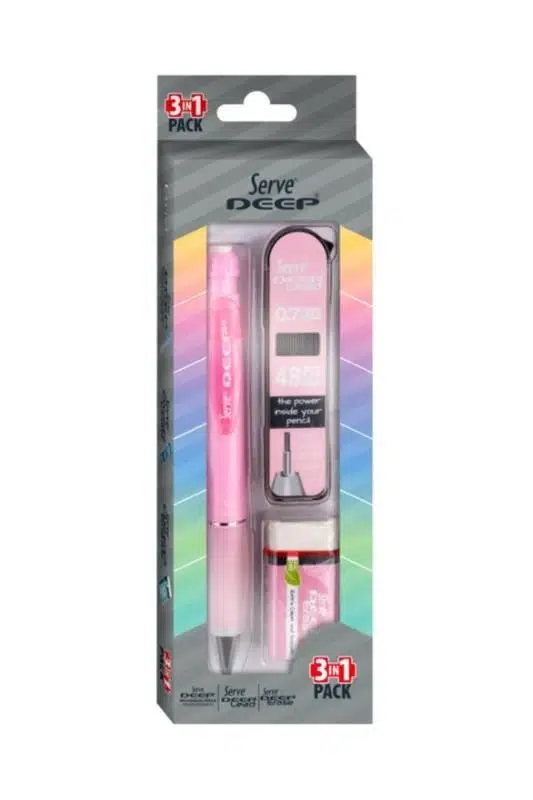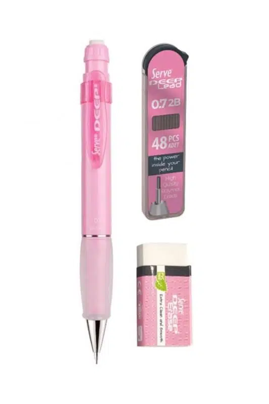 Serve Deep 0.7 mm Şeker Pembe 3’lü Kalem Seti; gizlenebilir metal uç mekanizmasına sahip versatil kalem, 48 adet yüksek kaliteli 2B grafit min ve beyaz silgiden oluşur. Okul, ofis ve günlük kullanım için tasarlanan bu set, ergonomik yapısı ve dayanıklı mekanizması sayesinde uzun ömürlü ve konforlu bir yazım deneyimi sunar.