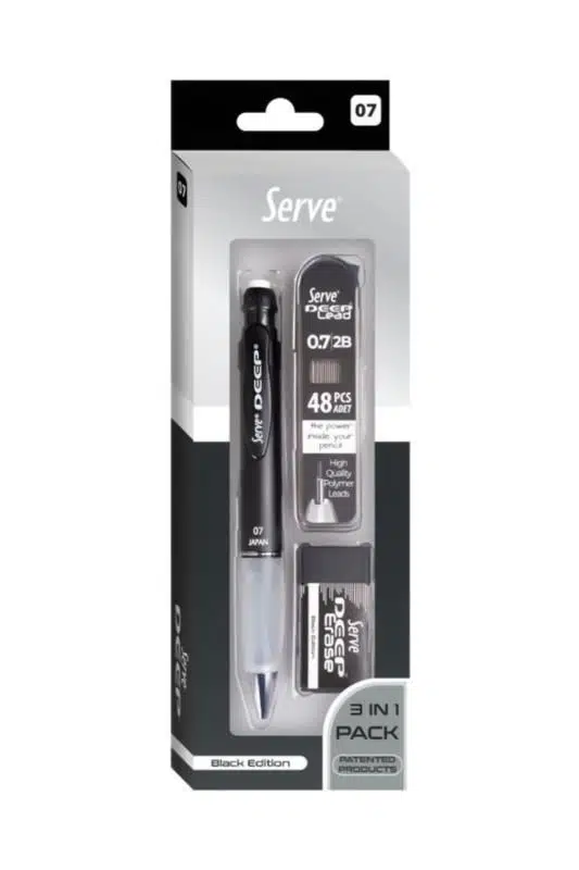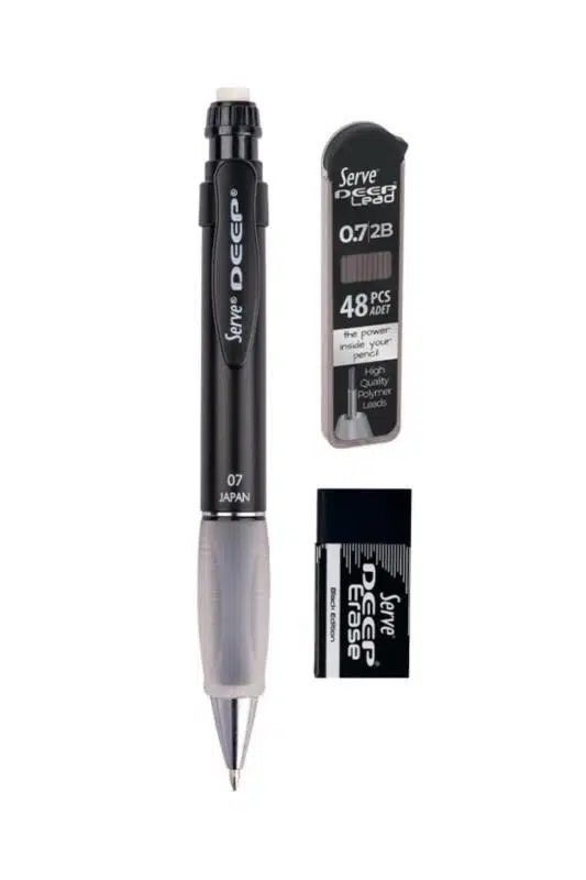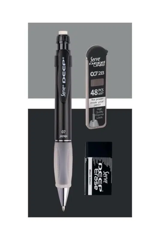 Serve Deep 3’lü Okul Seti – Metalik Siyah 0.7 mm Mekanik Versatil Kalem + 0.7 mm Min + Siyah Silgi
