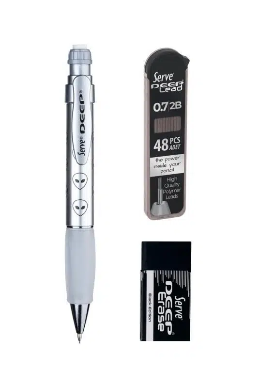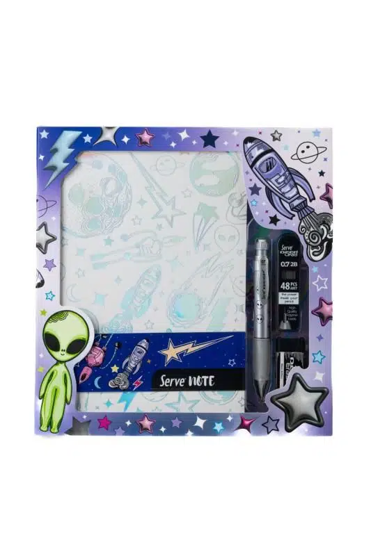 Serve Defter Seti Uzay Serisi Beyaz Kutulu SVNTSETUZYBYZ – Uzay Temalı Defter, 0.7 mm Mekanik Kalem, 48’li Yedek Uç, Silgi