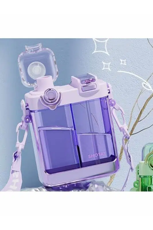 Shotay Tritan Çift Bölmeli Kawaii Su Matarası – 700 ml, Şeffaf Kapaklı, Pipetli & Emzikli, Askılı, Mor