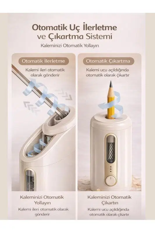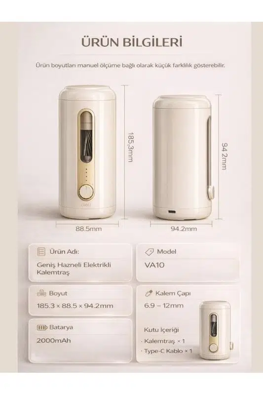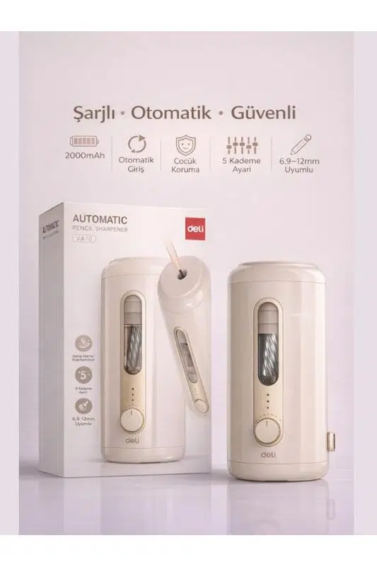 VA10 Bej Şarjlı Otomatik Elektrikli Kalemtıraş 2000mAh – 5 Kademe Uç Ayarlı, 6.9-12mm Jumbo Uyumlu, Type-C, Geniş Hazneli