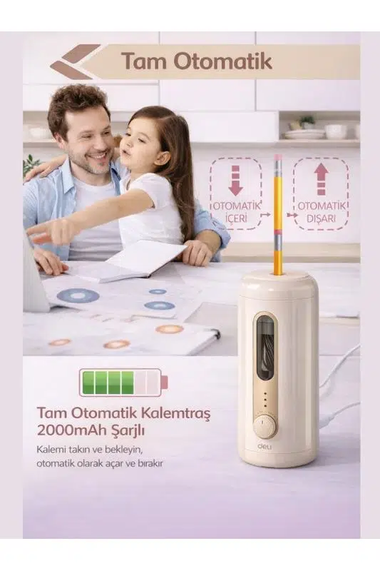 Deli VA10 Otomatik Elektrikli Kalemtıraş, güçlü spiral bıçak sistemi ve tam otomatik mekanizması sayesinde kalemlerinizi yalnızca 3 saniyede, zahmetsizce açar. Kalemi yerleştirdiğiniz anda otomatik olarak içeri alır, ideal keskinliğe ulaştığında otomatik olarak dışarı çıkarır.