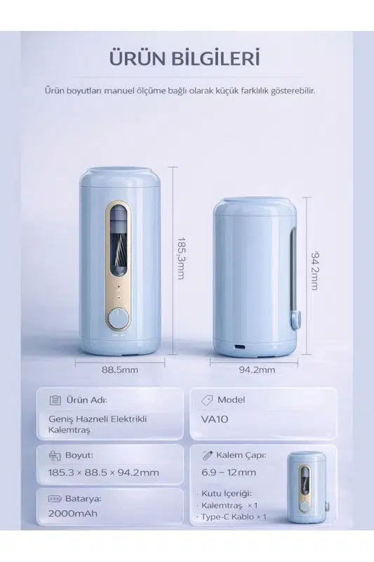 VA10 Mavi Şarjlı Otomatik Elektrikli Kalemtıraş 2000mAh – 5 Kademe Uç Ayarlı, 6.9-12mm Jumbo Uyumlu, Type-C, Geniş Hazneli