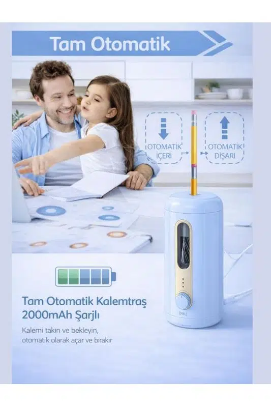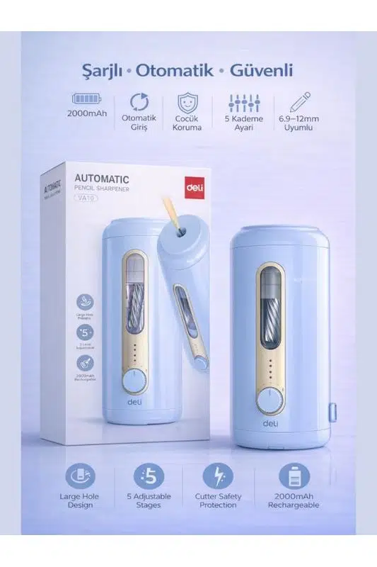 Deli VA10 Otomatik Elektrikli Kalemtıraş, güçlü spiral bıçak sistemi ve tam otomatik mekanizması sayesinde kalemlerinizi yalnızca 3 saniyede, zahmetsizce açar. Kalemi yerleştirdiğiniz anda otomatik olarak içeri alır, ideal keskinliğe ulaştığında otomatik olarak dışarı çıkarır.